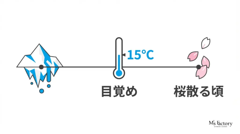 日本芝(高麗芝など)が本格的に成長を始めるのは、地温が15度を超えてからです。松本エリアでは、4月に入ってもまだ地中の温度は低いまま。ここで無理に刺激を与えすぎると、かえって株を弱めてしまいます。「桜の花が散り始める頃」が、本格的な更新作業をスタートさせる最適な目安となります。