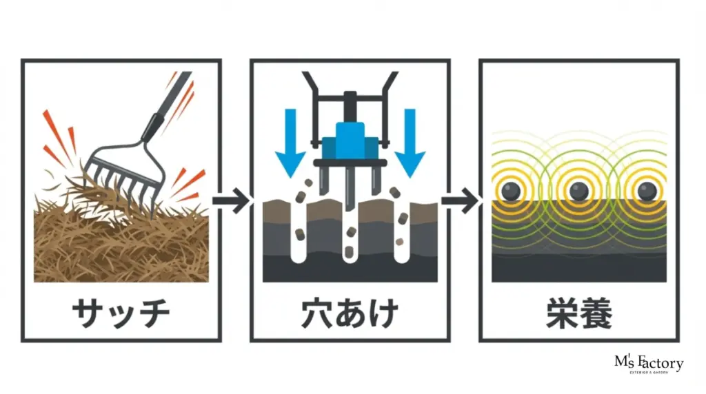 春先、見た目の緑を早く出そうと窒素肥料を大量に与えると、葉ばかりが伸びて根が育ちません。これでは、松本の過酷な夏の暑さと乾燥を乗り越えることができません。「春は根を作る時期」と割り切り、エアレーションで古い根を切り、新しい根が伸びるスペースを確保することを優先します。