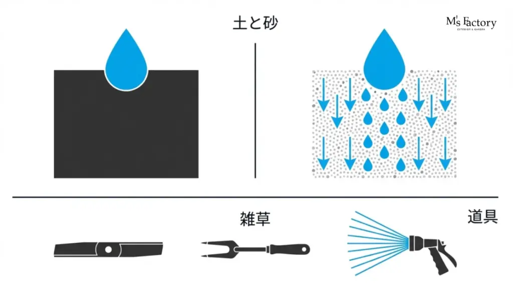市販されているものには「目土」と書かれた黒っぽい土状のものと、サラサラした「目砂」があります。これらは単に色が違うだけでなく、役割が明確に異なります。「現在の庭の水はけ」を基準に選ぶのが、プロが教える判断基準です。