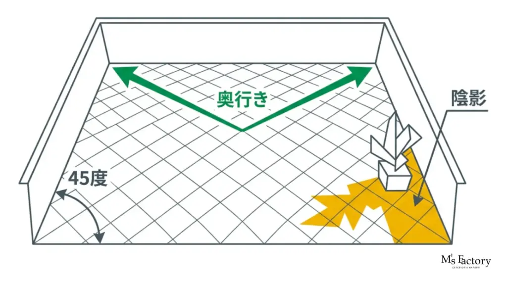 • 斜め45度のライン取り: タイルの目地や通路を、建物に対して45度の角度で配置します。対角線が強調されることで、視覚的な奥行きが約1.4倍に感じられます。