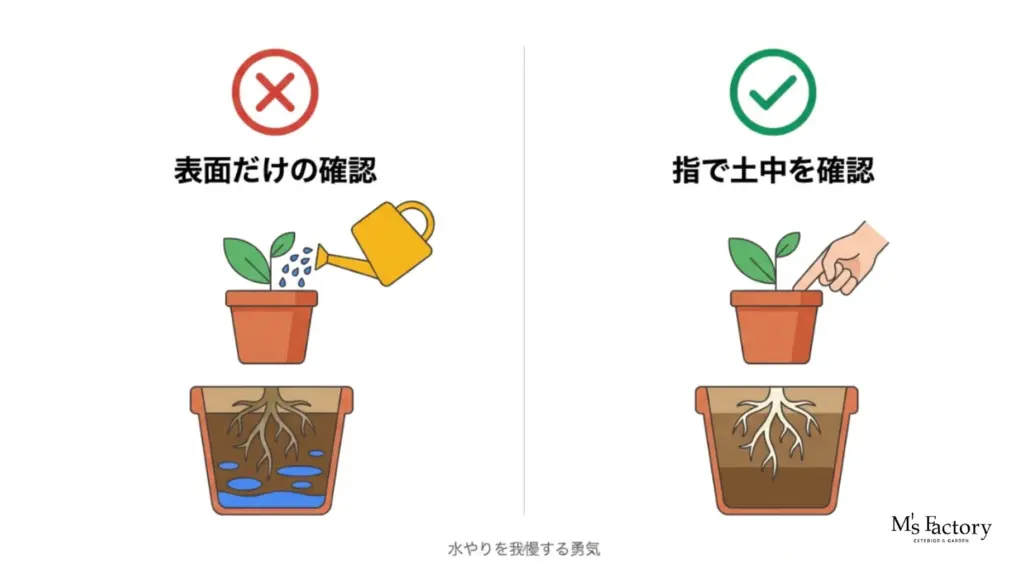- 土の観察: 指で触れてみて、表面だけでなく中まで乾いているかチェックします。