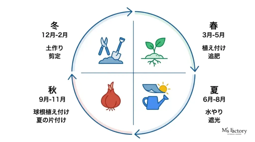 暑さが落ち着く秋は、春に次ぐ第2のガーデニングシーズンです。春に咲く球根(チューリップやムスカリなど)を植えるのはこの時期です。また、冬に向かって徐々に水やりの頻度を減らし、植物を寒さに慣れさせていきます(耐寒性を高める)。