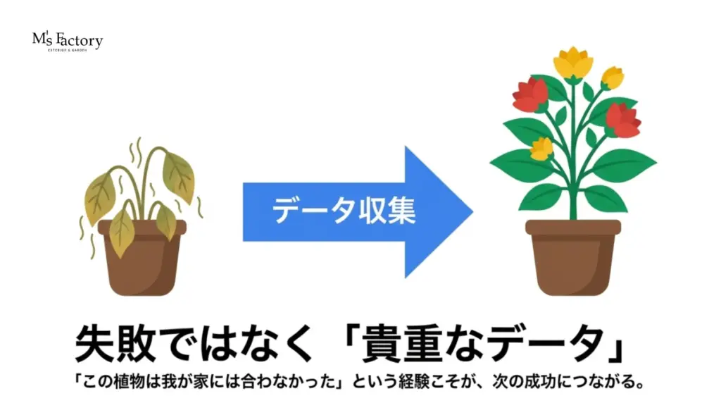 最後に、心構えについてお伝えします。どれほど経験豊富な園芸家でも、植物を枯らしたことがない人はいません。私も数え切れないほどの植物を枯らしてきました。しかし、それは失敗ではなく「データ収集」だと捉えてください。