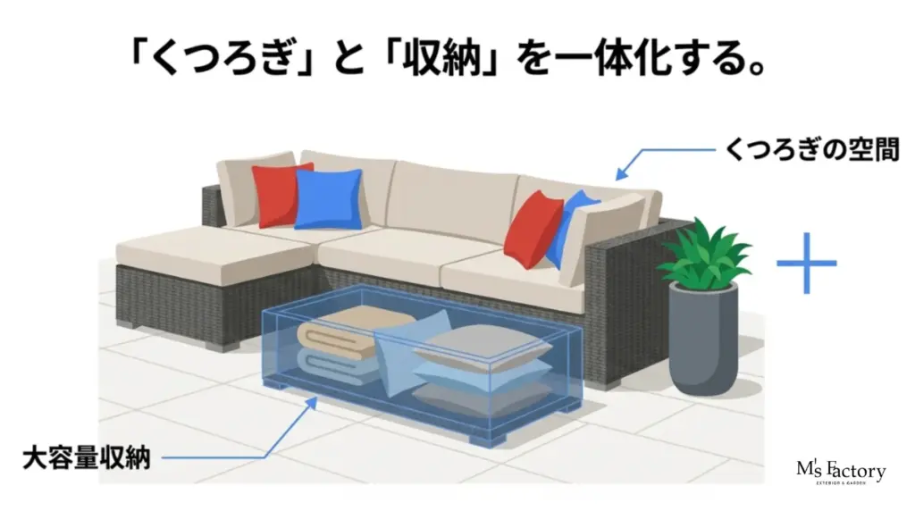 海外のリゾートホテルなどでよく見かけるこのタイプは、見た目は豪華なソファセットですが、クッションを外して座面を持ち上げると、大容量のストッカーが現れます。ここには、普段使わない時のクッション自体や、膝掛け、ガーデン雑誌、ランタンなどをしまっておくことができます。「座る場所」そのものが「収納場所」になるため、新たなスペースを確保する必要がなく、限られたテラスやウッドデッキを最大限に有効活用できるのが最大のメリットです。