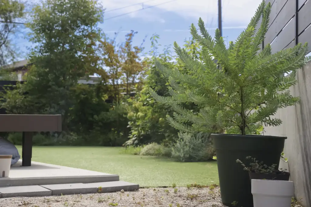 縦のラインを強調する: 高さのあるフェンスやパーゴラ、スラっとした樹形の樹木などを取り入れると、視線が横方向だけでなく縦方向にも広がり、空間全体が伸びやかに感じられます。