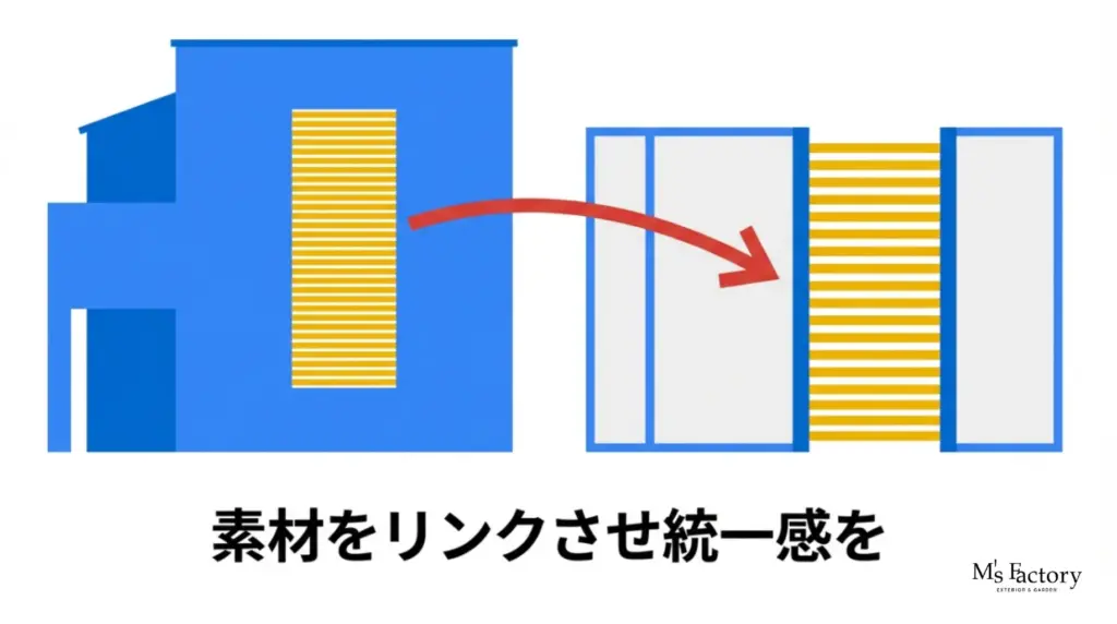 まずは、住宅の主要なパーツに使われている素材を特定しましょう。それらの「色」「質感」「光沢」を、外構のどこかに取り入れます。