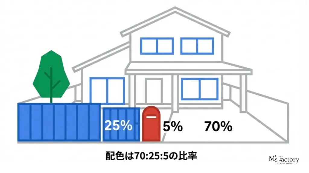 外構全体の色構成を考える際、闇雲に色を増やすのではなく、役割に応じた比率で配分すると、驚くほどまとまりが良くなります。