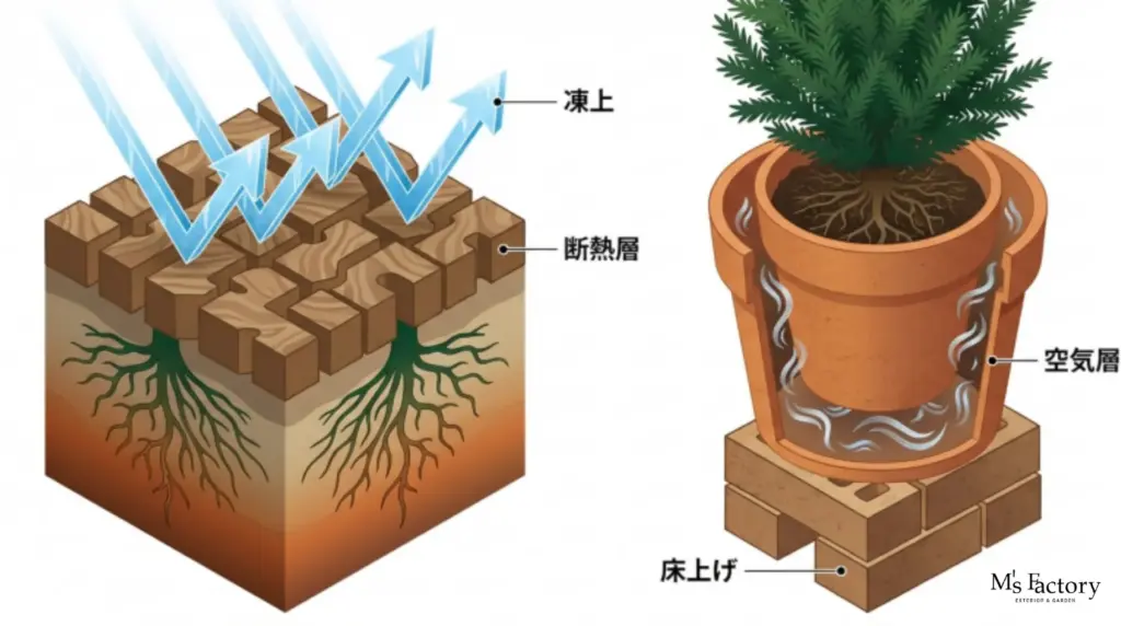 長野の冬、植物にとって最大の敵は「寒さ」そのものよりも、地面が凍ることによる「根へのダメージ」です。気温がマイナスを下回ると、土壌中の水分が凍って膨張し、地面が盛り上がります。これが「凍上」です。凍上が起きると、植物の根が土から引きちぎられたり、根が露出して乾燥した寒風に晒されたりして、枯死の原因となります。この物理的な破壊から植物を守るために、最も効果的で手軽な手段が「マルチング」です。