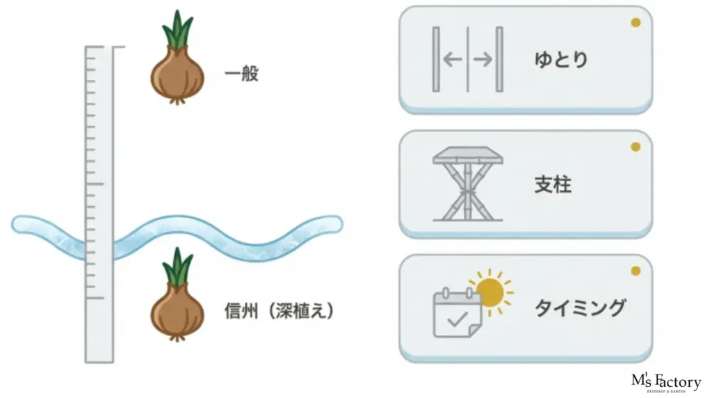 信州の庭で球根を植える際、最も注意すべきは植え付けの深さです。一般的な園芸書には「球根2〜3個分の深さ」と書かれていますが、凍上(地面の凍り上がり)が激しい長野県内では、少し深めに植えるのが鉄則です。浅すぎると地表の凍結によって球根が押し出されたり、根が傷んだりするリスクが高まります。特にチューリップなどは、深めに植えることで春の急激な気温上昇による徒長(ひょろひょろ伸びること)を防ぐ効果も期待できます。私自身、安曇野の現場では、目安よりも5cmほど深く植えることを推奨していますが、これにより雪解け直後の霜害を回避しやすくなります。