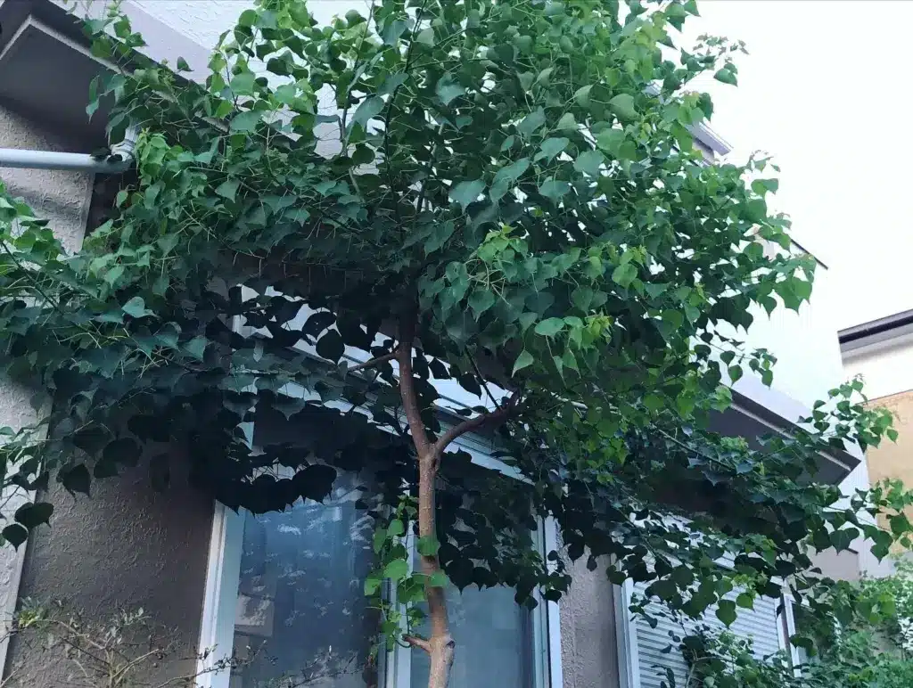 一本の太い幹がドーンと立っている木は圧迫感がありますが、根元から細い幹が数本立ち上がっている「株立ち」の木は、軽やかで視線が抜けます。さらに、目線の高さ(1.5m〜1.8m付近)に枝葉が少なく、上の方で枝が広がっている樹形を選べば、視界を遮ることなく、頭上に心地よい緑の天井(キャノピー)を作ることができます。