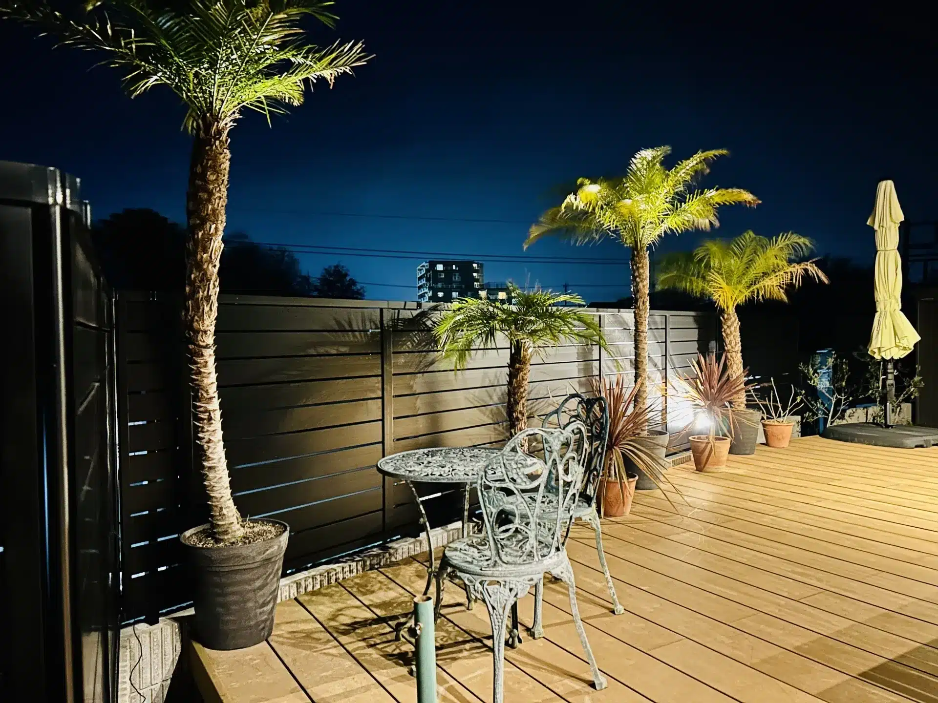 ウッド調家具を取り入れる際は、床材(ウッドデッキ)と同化しないように注意が必要です。デッキが木製なら家具はラタンやアイアンにする、あるいはデッキの上にラグを敷いてゾーニングするなど、素材のコントラストをつけることで、家具の存在感が際立ちます。