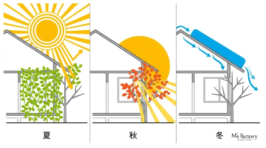 - 多層構造による遮光: つる植物だけでなく、背の高い落葉樹を外側に植えることで、二重の遮光壁を作り出します。これにより、真夏の日中でも室内のエアコン効率が劇的に向上します。