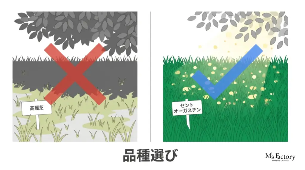 日陰で育てるなら、少ない光でも光合成ができる「耐陰性(たいいんせい)」の高い品種を選ぶことが絶対条件です。一般的に、日本芝よりも西洋芝の一部に耐陰性が強いものが多く存在します。まずは、ご自宅の庭の日照時間を確認し、それに耐えられる品種を選定することから始めましょう。