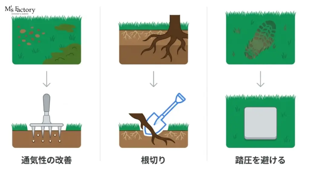 日陰は微生物の活動が鈍くなりがちで、サッチが分解されずに溜まりやすい傾向にあります。サッチが溜まると通気性が悪化し、常にジメジメした状態になって根腐れや病気を引き起こします。年に1〜2回はレーキを使って丁寧にサッチを取り除く(サッチング)作業を行いましょう。また、ローンスパイクなどで地面に穴を開ける「エアレーション」を行い、土の中に新鮮な酸素を送り込むことも、弱りがちな根を活性化させるために不可欠な作業です。