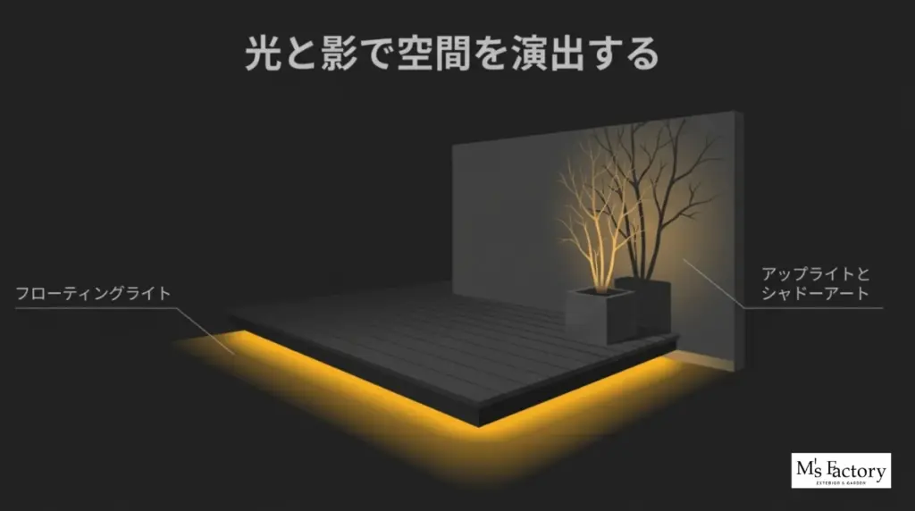下方向への光が地面を照らすことで、デッキ全体が闇の中に浮かび上がっているような浮遊感を演出できます。光源が直接目に入らないため、「グレア(不快な眩しさ)」がなく、落ち着いた大人の空間になります。リビングの照明を少し落として、窓の外に浮かぶ光のラインを眺めながらお酒を楽しむ。そんな贅沢な時間が、簡単な照明計画ひとつで手に入ります。