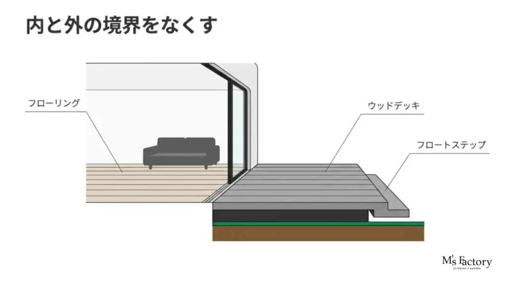 シンプルモダンの真骨頂は、内と外の境界を曖昧にする「シームレスな繋がり」にあります。これを実現するためには、リビングのフローリングとウッドデッキの高さを可能な限り揃える「フラットサッシ」対応の施工や、床の高さを調整する工夫が必要です。