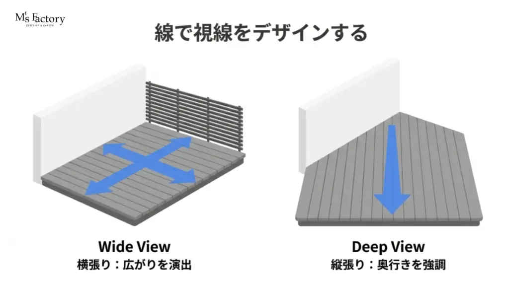 ウッドデッキの板をどの方向に張るか(縦張り・横張り)は、空間の見え方を操作する強力なツールです。単に下地の都合で決めるのではなく、どのような視覚効果を狙うかで決定すべきです。