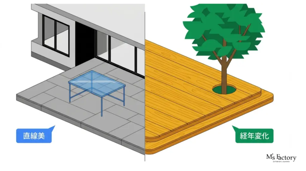 地上と異なり、上層階のテラスは「風の影響」と「重量制限」という2つの大きな制約があります。安全性を担保しつつ、上質な空間を作るための素材選定を以下の表にまとめました。