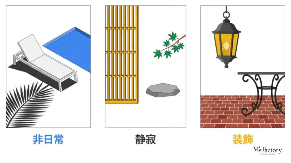 - 水音の演出: 小さな噴水や水盤(ウォーターパネル)を設置することで、水の音によるリラックス効果が加わり、リゾート感が一気に高まります。