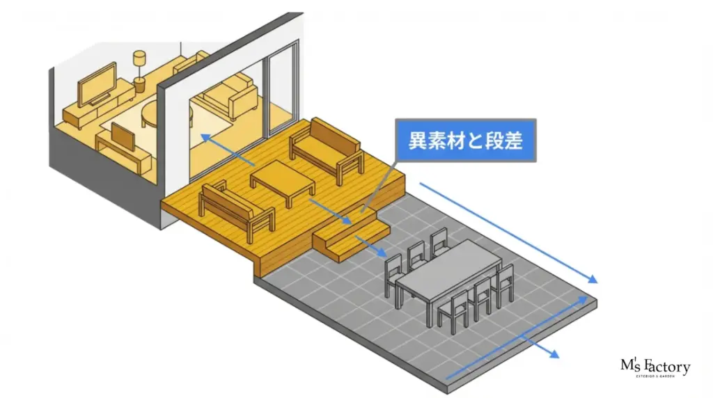段差を作ることで、壁や仕切りを設けなくても心理的に異なる空間として認識されます。