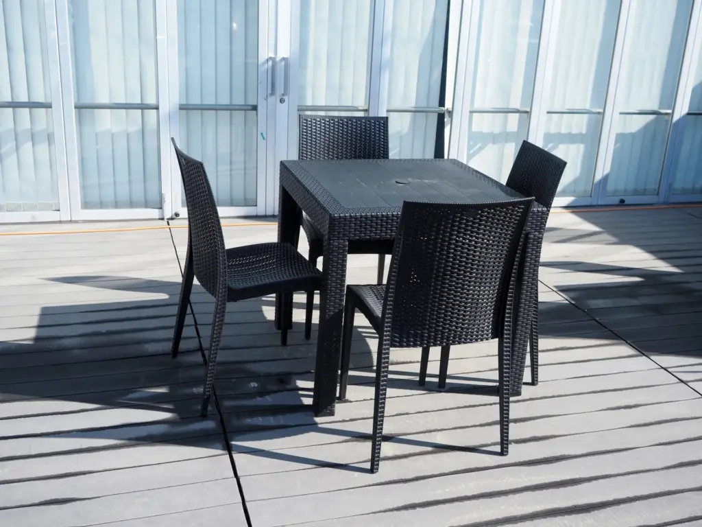 ・チェア:雨に濡れても大丈夫な樹脂製やアルミ製が安心。また、使わない時にスタッキング(重ね置き)できるタイプを選ぶと、掃除や収納の際に非常に便利ですよ。