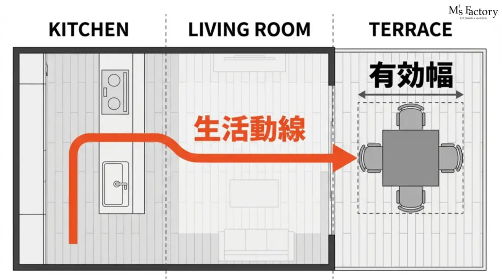 動線を考える際、見逃せないのが「人が通るための幅」と「家具を置いた時の余白」です。家具に邪魔されて通りにくいテラスは、次第に足が遠のいてしまいます。