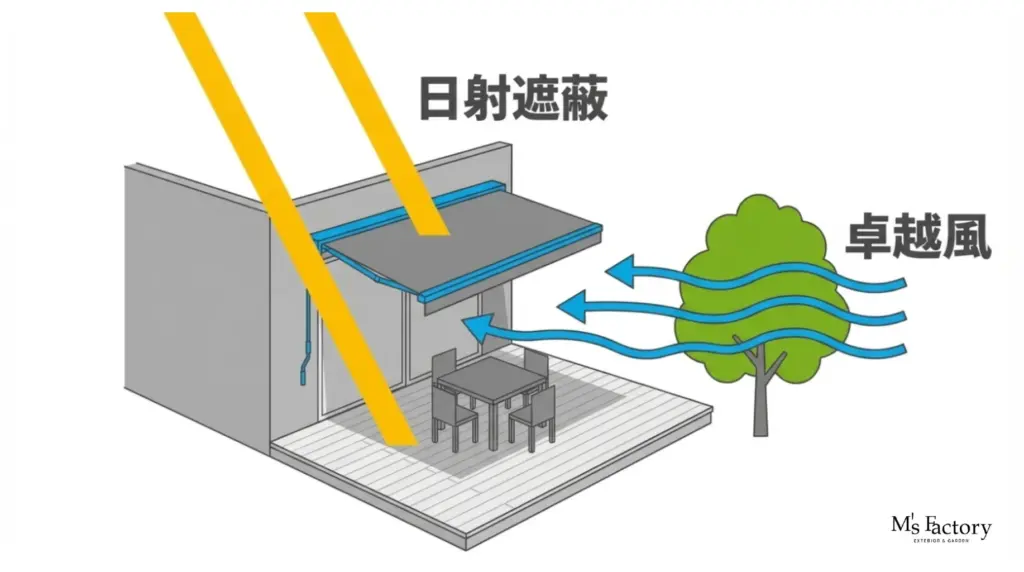 - オーニングのメリット: 建物の外壁に設置し、カフェのような洗練された外観を演出。強い西日を窓の外でカットするため、エアコンの負荷を劇的に減らします。
