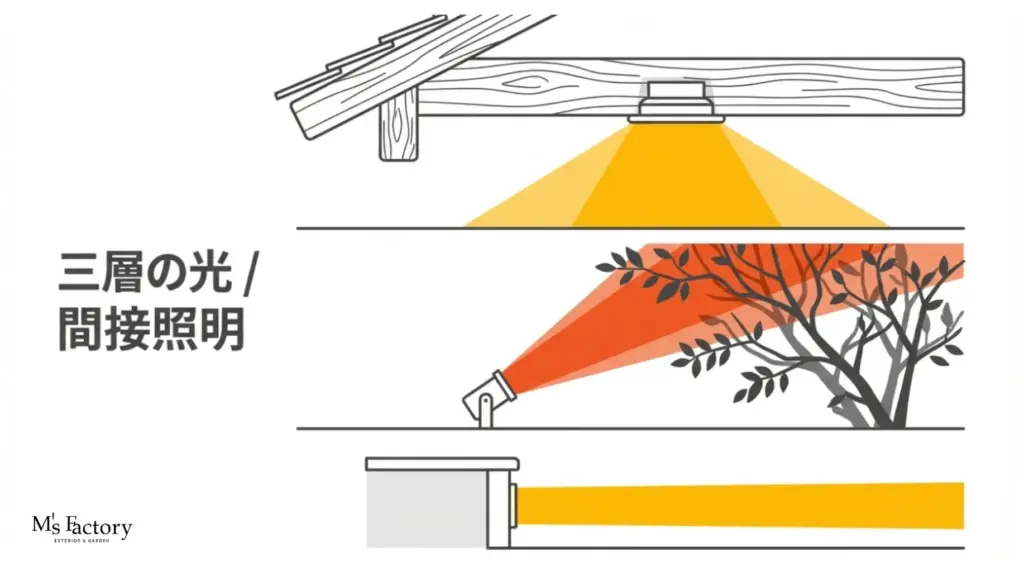 夜間の使用頻度が高いテラスには、以下の3つのレイヤーで照明を計画しましょう。