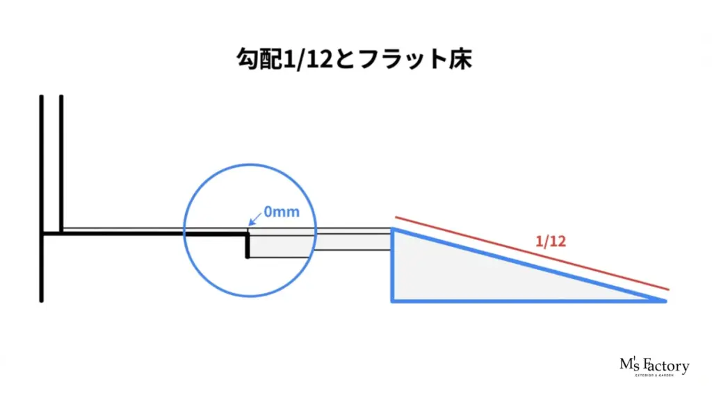 - 水勾配(みずこうばい)の計算: フラットにすると雨水が室内へ侵入する懸念がありますが、デッキ材の隙間から排水する構造や、グレーチングを併用することで解決可能です。