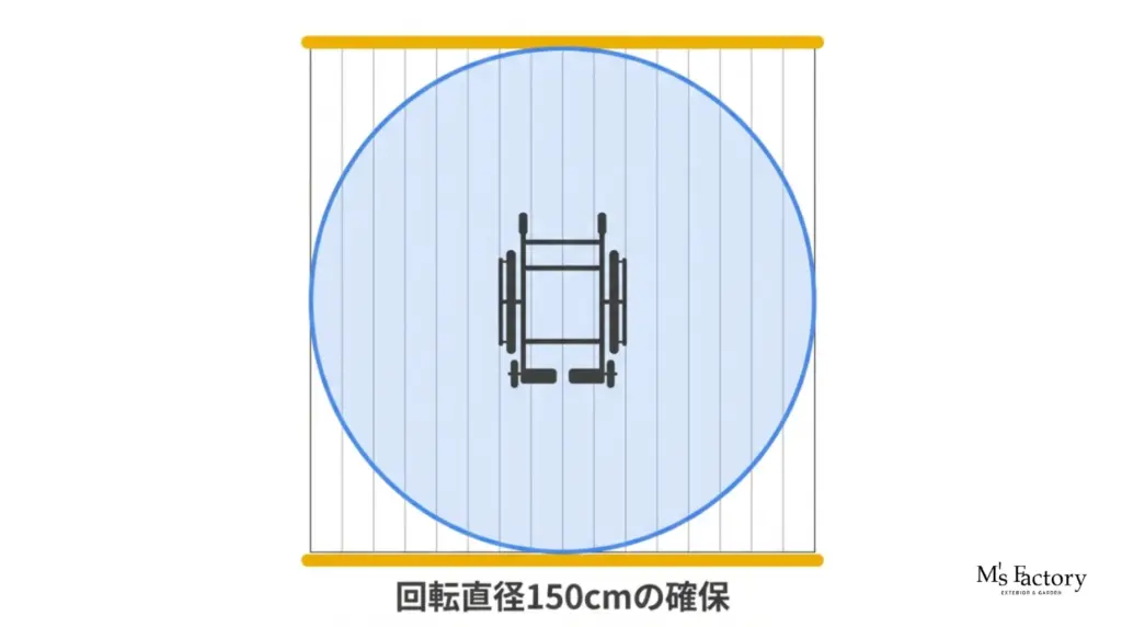 - 折り返し地点の確保: 折り返し場所は車いすが一回転できる150cm×150cmの広さを必ず確保します。