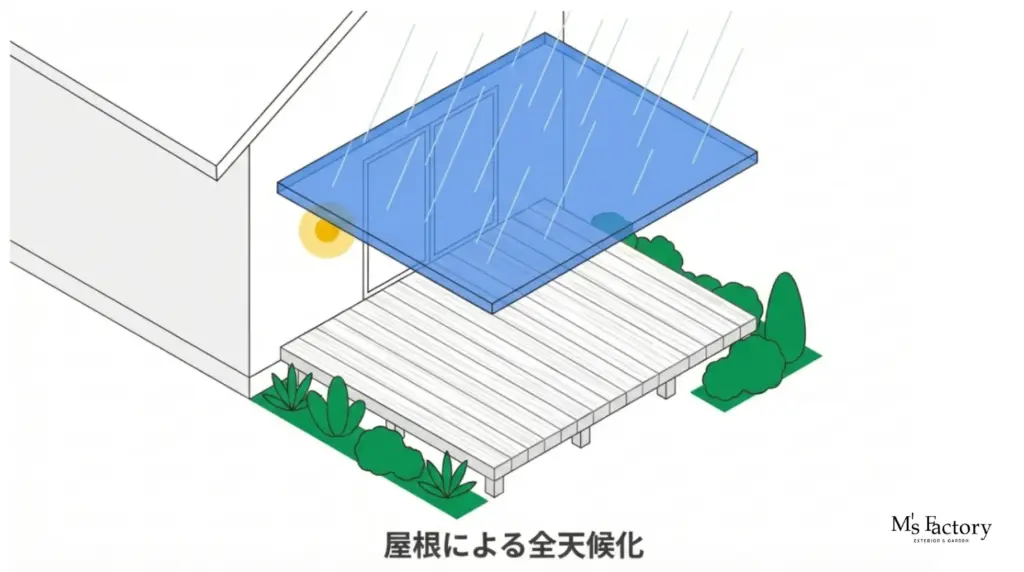 バリアフリーにおいて、雨は外出を阻む大きな壁となります。床面が濡れて滑りやすくなるだけでなく、車いすの操作が困難になり、介助者の負担も増大します。「濡れない環境」を物理的に作り出すテラス屋根の設置は、バリアフリーウッドデッキの完成度を100%に引き上げるための必須工程です。