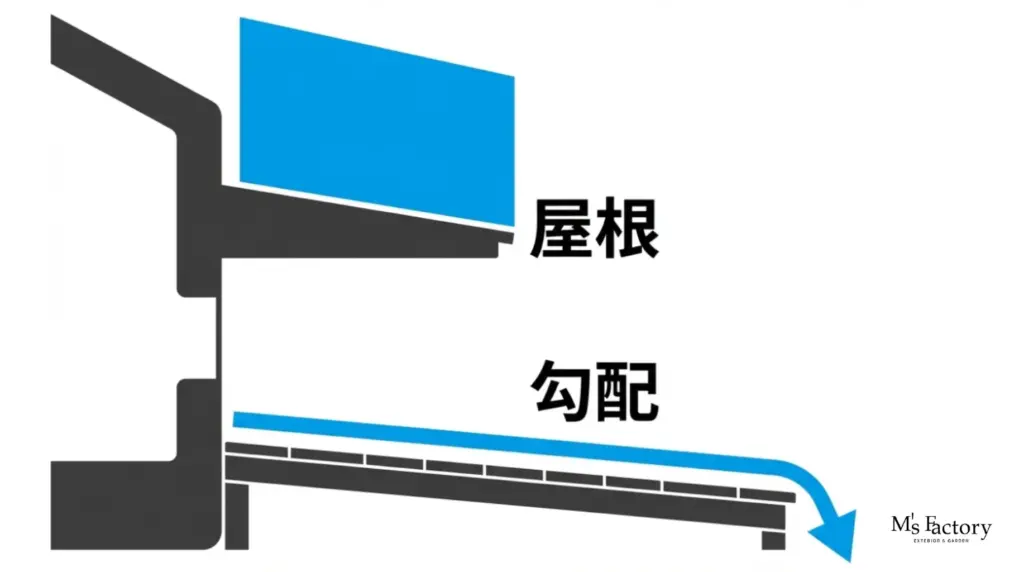 防水の基本は、水を防ぐこと以上に「水を逃がす」ことにあります。設計段階でわずかな傾斜(勾配)をつけるだけで、雪解け水の滞留時間は劇的に短縮されます。
