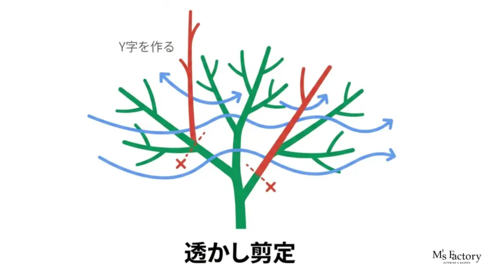 1. 「Y字」を意識する: 枝分かれしている箇所で、太すぎる枝や逆向きの枝を抜き、きれいなY字が重なるように整えます。