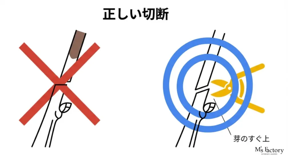 • 正しい切り方: 必ず「枝の付け根(ブランチカラー)」または「芽のすぐ上(5mm程度)」で、斜めに切るのが鉄則です。
